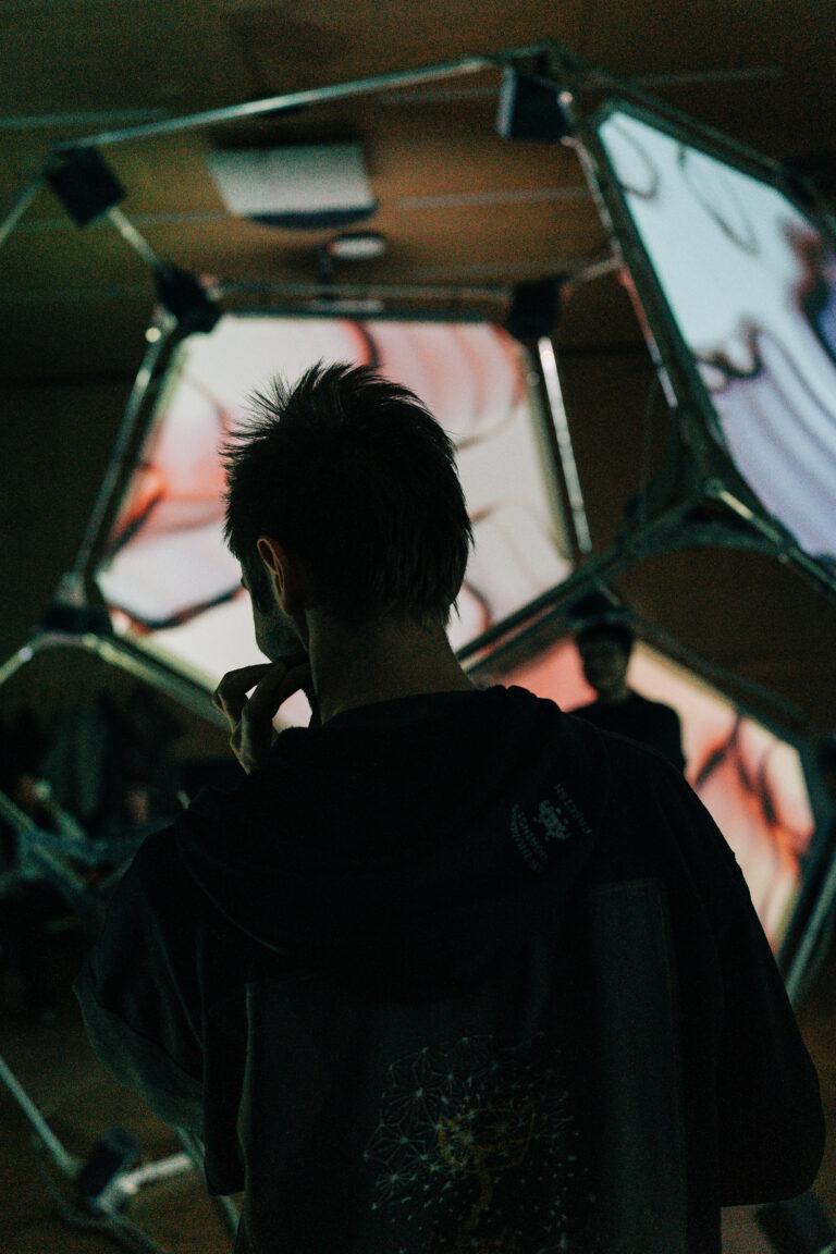 Spatial A/V is an ongoing project series built around a 4-meter ambisonic structure: a dodecahedral frame equipped with 20 OTTOsonics speakers, a subwoofer, and up to ten projection surfaces. As the system expands into light and projection, the dodecahedron becomes an extended audiovisual canvas, allowing for extended narratives and playful interactions.