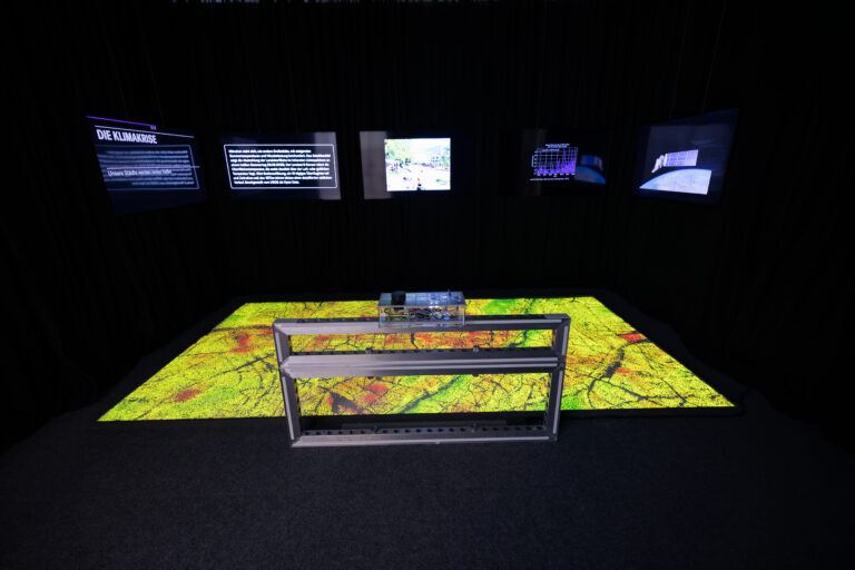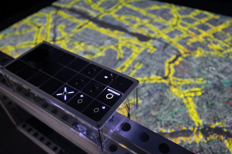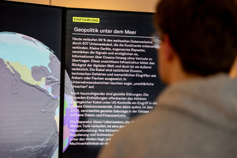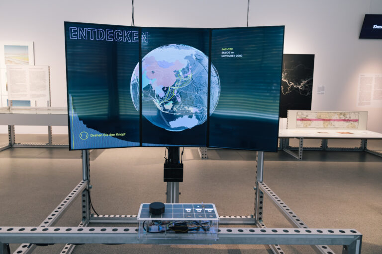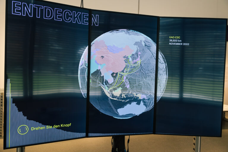 Die digitale Cloud ist allgegenwärtig. Für uns ist sie jedoch nur durch die unzähligen Geräte und Bildschirme sichtbar, die unseren Alltag bestimmen: Smartphones, Laptops, smarte Haushaltsgeräte, Fahrzeugschnittstellen und zahllose Displays im städtischen Raum. Für „City in the Cloud – Data on the Ground“ im Architekturmuseum der TUM, Pinakothek der Moderne – kuratiert von Damjan Kokalevski – entwickelten wir interaktive Exponate, die den materiellen Fußabdruck digitaler Systeme thematisieren: Rechenzentren in urbanen und abgelegenen Räumen, globale Unterseekabelnetze und die Rohstoffe, auf denen die Infrastruktur basiert. Die Ausstellung läuft vom 15. Oktober 2025 bis 8. März 2026.