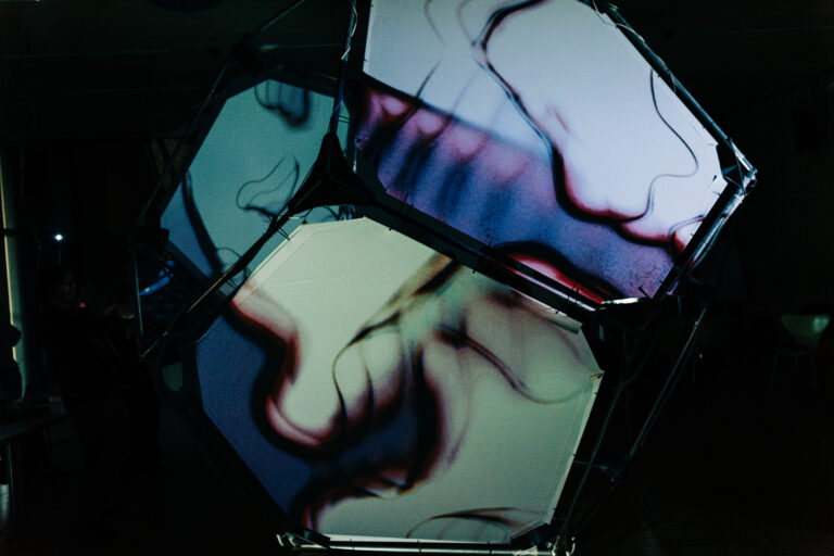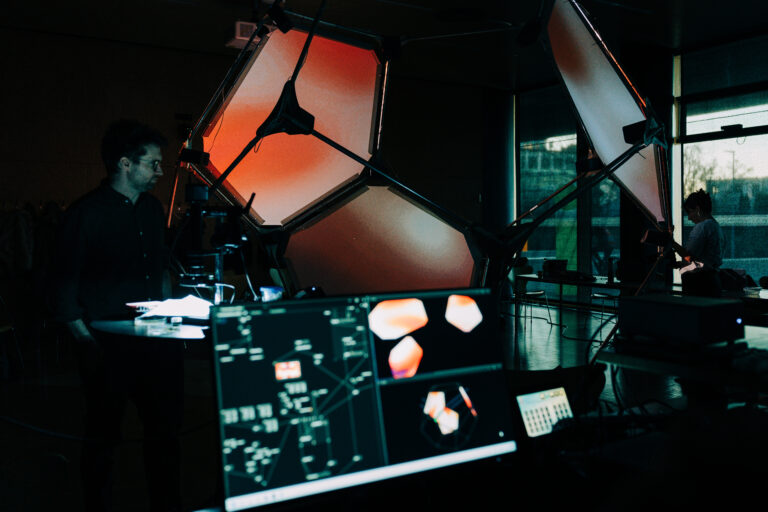 Indem sich Klangquellen mit beliebigen Geschwindigkeiten bewegen, wird Bewegung selbst zum kompositorischen Material: langsame, lesbare Verläufe kollidieren mit synthetischen, ungewohnten Klangfarben und entfalten eine Spannung zwischen Wiedererkennen und Desorientierung. Mit der Erweiterung um Licht und Projektion wird der Dodekaeder zur räumlichen audiovisuellen Leinwand. Weiterentwickelt wurde das System in einer Residency beim WOW Signal Festival (Wien) sowie in einem Workshop an der USTP Austria, in dem Studierende audiovisuelle Narrative über Raum, Zeit und Interaktion entwickeln – zur Präsentation beim Lucid Dreams Festival im Mai 2026.